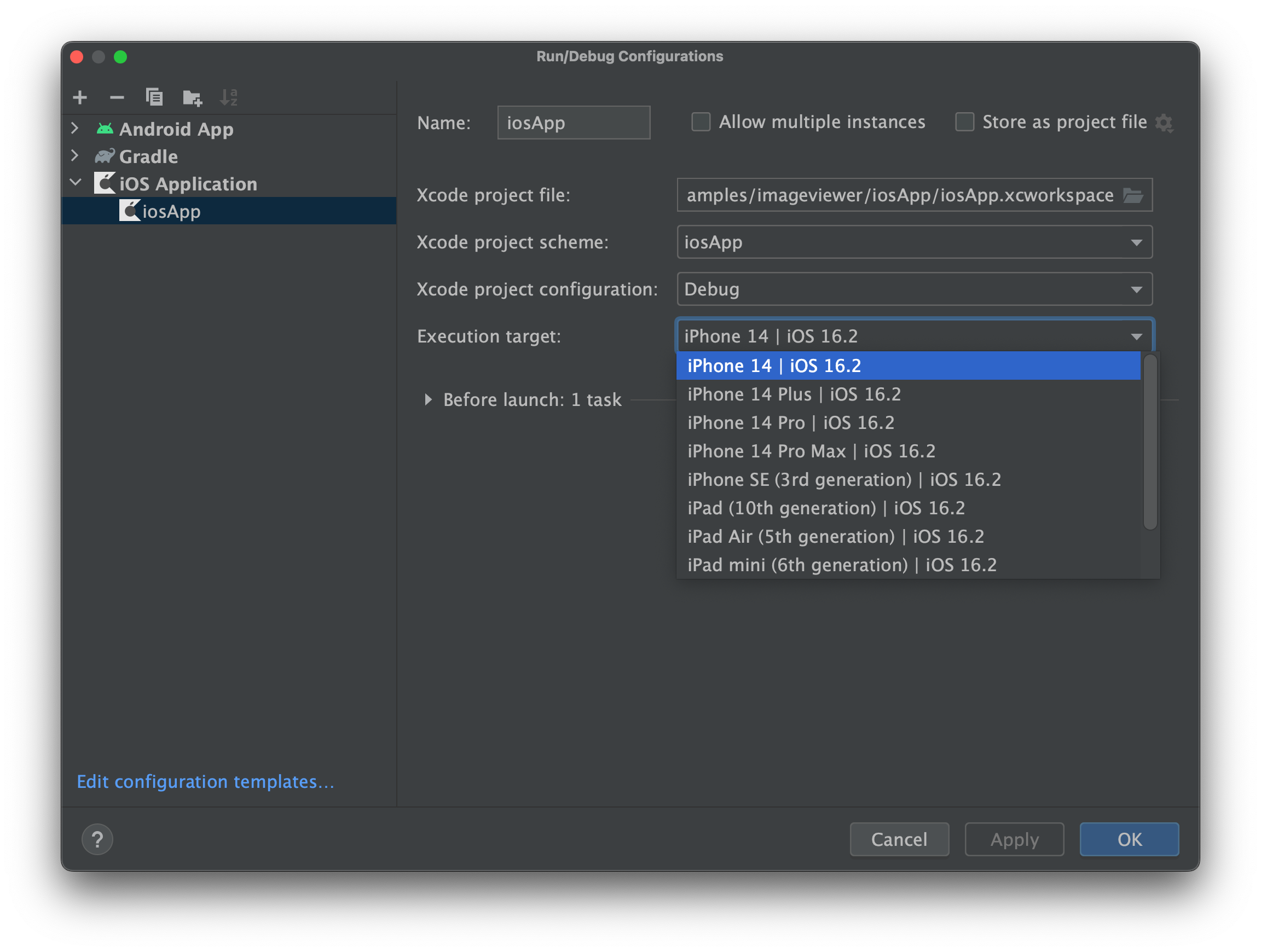 Once you have configured your environment correctly, you will be able to select which iOS simulator to run your application in Android Studio on by modifying the iosApp run configuration.